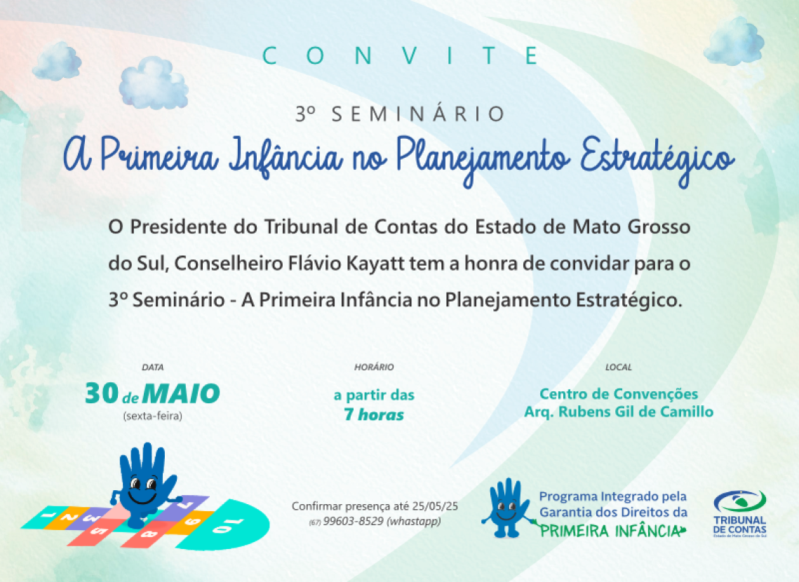 O Tribunal de Contas do Estado de Mato Grosso do Sul promove, no próximo dia 30 de maio de 2025, o 3º Seminário “A Primeira Infância e o Planejamento Estratégico”, a partir das 7h, no Centro de Convenções Arquiteto Rubens Gil de Camillo, no Palácio Popular da Cultura, localizado no Parque dos Poderes, em Campo Grande.