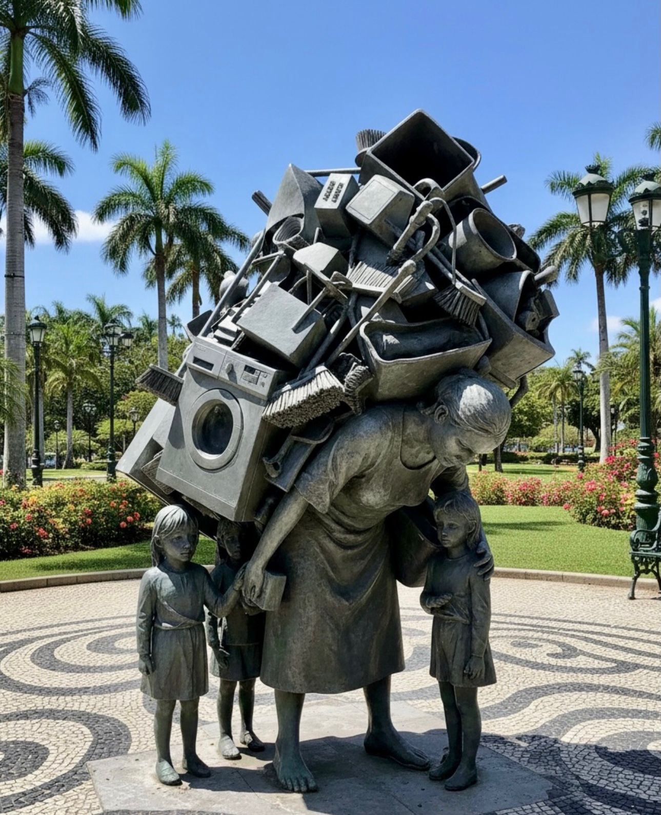Ela é um exemplo poderoso de como a Inteligência Artificial pode ser usada para materializar metáforas complexas e nos ajudar a refeletir sobre muitas questões da chamada vida real. Que, embora pareça uma escultura de bronze real em uma praça pública, trata-se de uma representação digital que toca em uma ferida aberta da sociedade: a sobrecarga feminina.