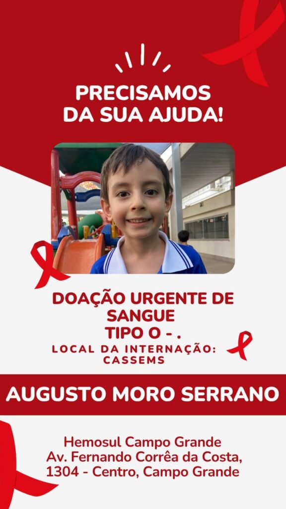 O pequeno Augusto Moro Serrano, de apenas 4 anos, precisa da ajuda de doadores de sangue O- em Mato Grosso do Sul. O menino nasceu com uma deficiência em uma enzima no sangue, uma condição muito rara, que eventualmente exige que ele receba transfusões desse tipo sanguíneo.