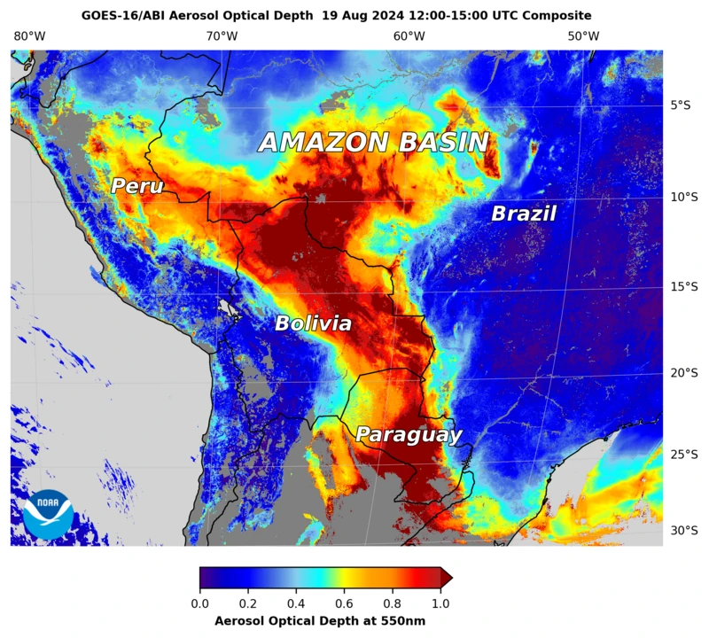 Imagens de Satélite disponibilizadas por instituições como a Administração Oceânica e Atmosférica Nacional dos EUA (NOAA) ou a Agência Espacial Americana (Nasa) mostram essa poluição avançando, se espalhando desde o Norte do Brasil e da Bolívia para regiões do Paraguai, Argentina, Mato Grosso do Sul, Santa Catarina e, Rio Grande do Sul