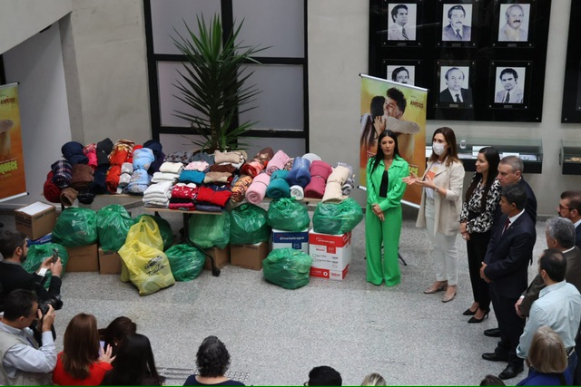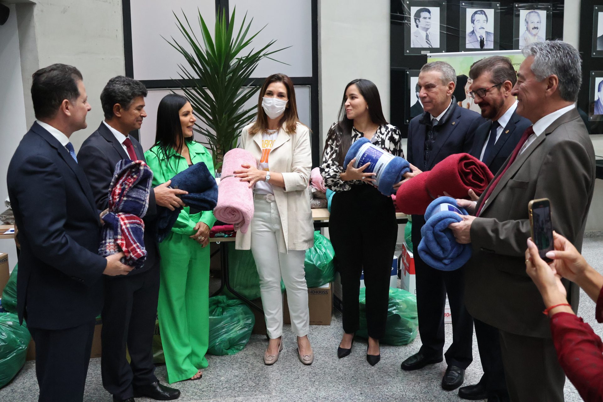 Com mais de 128 mil cobertores e roupas arrecadados, a Campanha “Seu Abraço Aquece” ainda recebeu 500 peças doadas pela Assembleia Legislativa nesta quinta-feira (22). A entrega foi feita pelos deputados Paulo Corrêa, Pedro Kemp, Renato Câmara, Roberto Hashioka, Rinaldo Modesto, e pela primeira-dama da Alems, esposa do presidente Gerson Claro, Kátia Claro. Os ítens foram arrecadados pelos servidores como parte das ações do primeiro Arraiá da ALEMS.