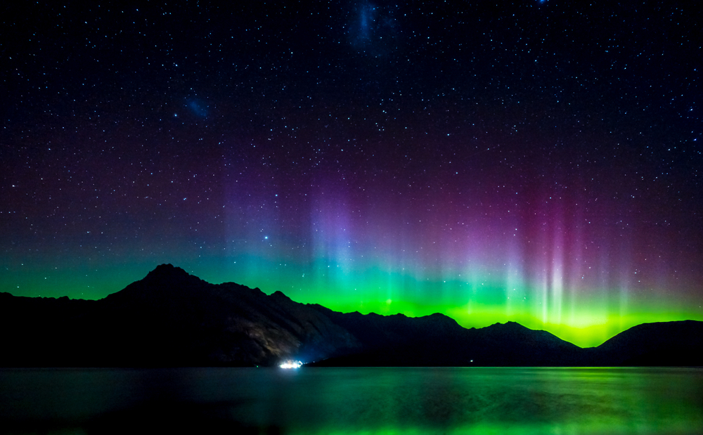 Aurora Austral e via láctea no Lake Wakatipu, na Nova Zelândia. Imagem Shutterstock