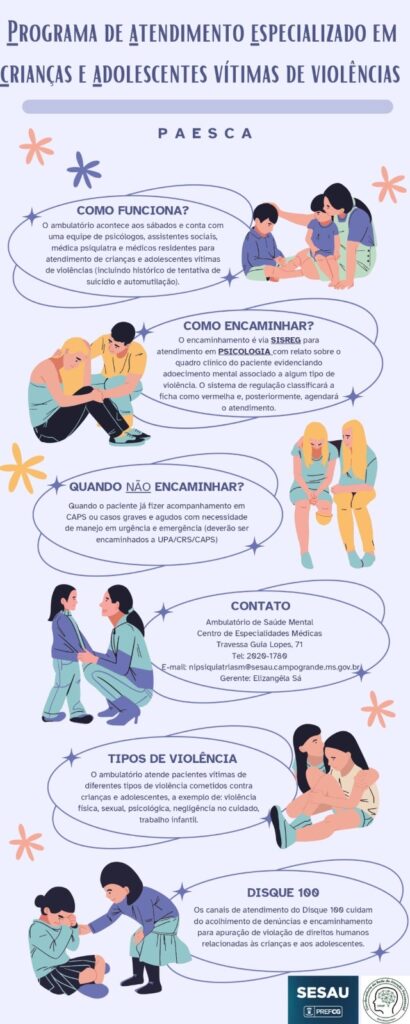 Todos os anos, o Brasil registra cerca de 35 mil casos de violência contra crianças e adolescentes, segundo o Ministério da Saúde. No entanto, esse número pode ser bem maior, pois muitas vítimas têm medo de denunciar a violência sofrida. Com o objetivo de atender esse público, a Prefeitura de Campo Grande criou o PAESCA – Programa de Atendimento Especializado em Crianças e Adolescentes vítimas de violência, suicídio e automutilação, que desde junho do ano passado está sob a responsabilidade da Coordenadoria de Saúde Mental da Secretaria Municipal de Saúde (Sesau).