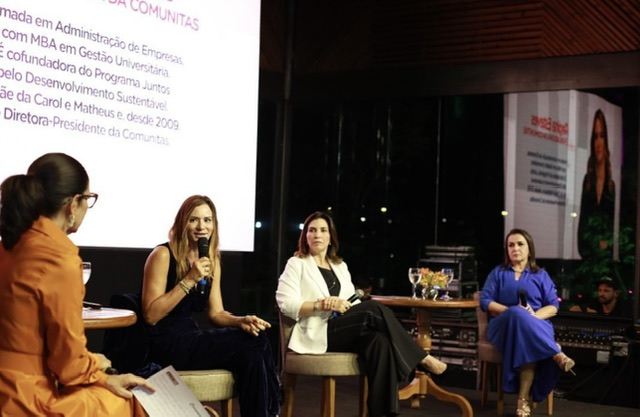 A diretora-presidente da organização Comunitas e co-fundadora do Programa Juntos pelo Desenvolvimento Sustentável, Regina Esteves, compartilhou suas experiências como mulher líder e que ocupa lugar de destaque no mundo empresarial. “Eu atuo muito nessa modelagem público privado em prol da administração pública, que é onde a gente gera impacto e consegue levar o investimento que seja social ou corporativo, mas que gera um grande impacto para toda a sociedade. Eu acredito que nesse papel a mulher pode ser uma grande protagonista desse engajamento na sociedade. Temos que assumir o protagonismo porque ele já é nosso”, afirmou.