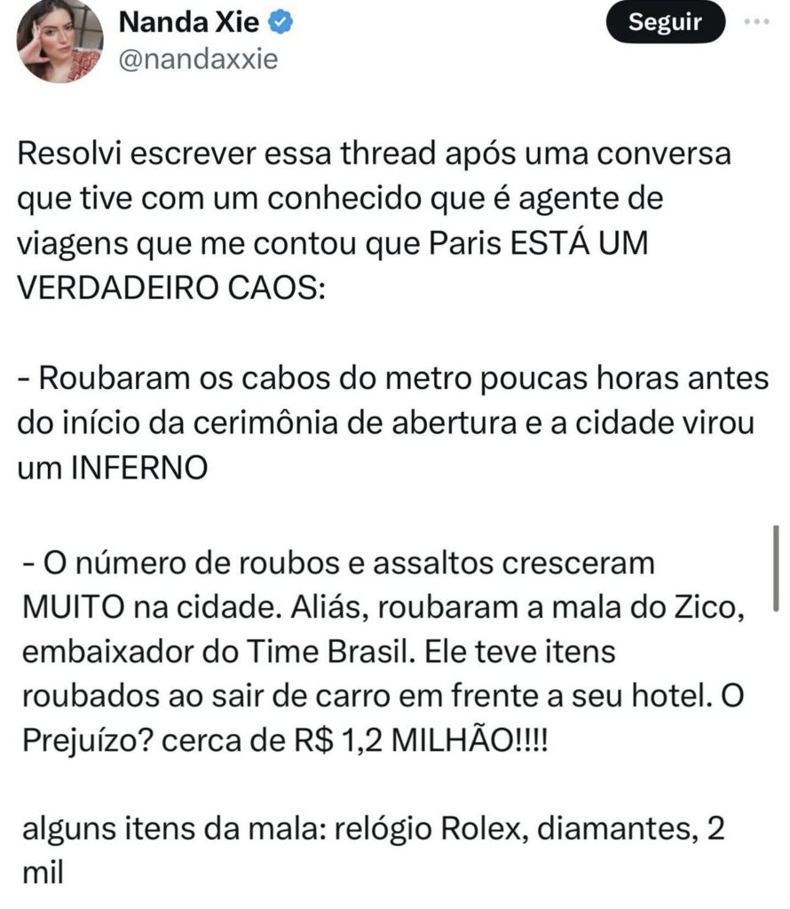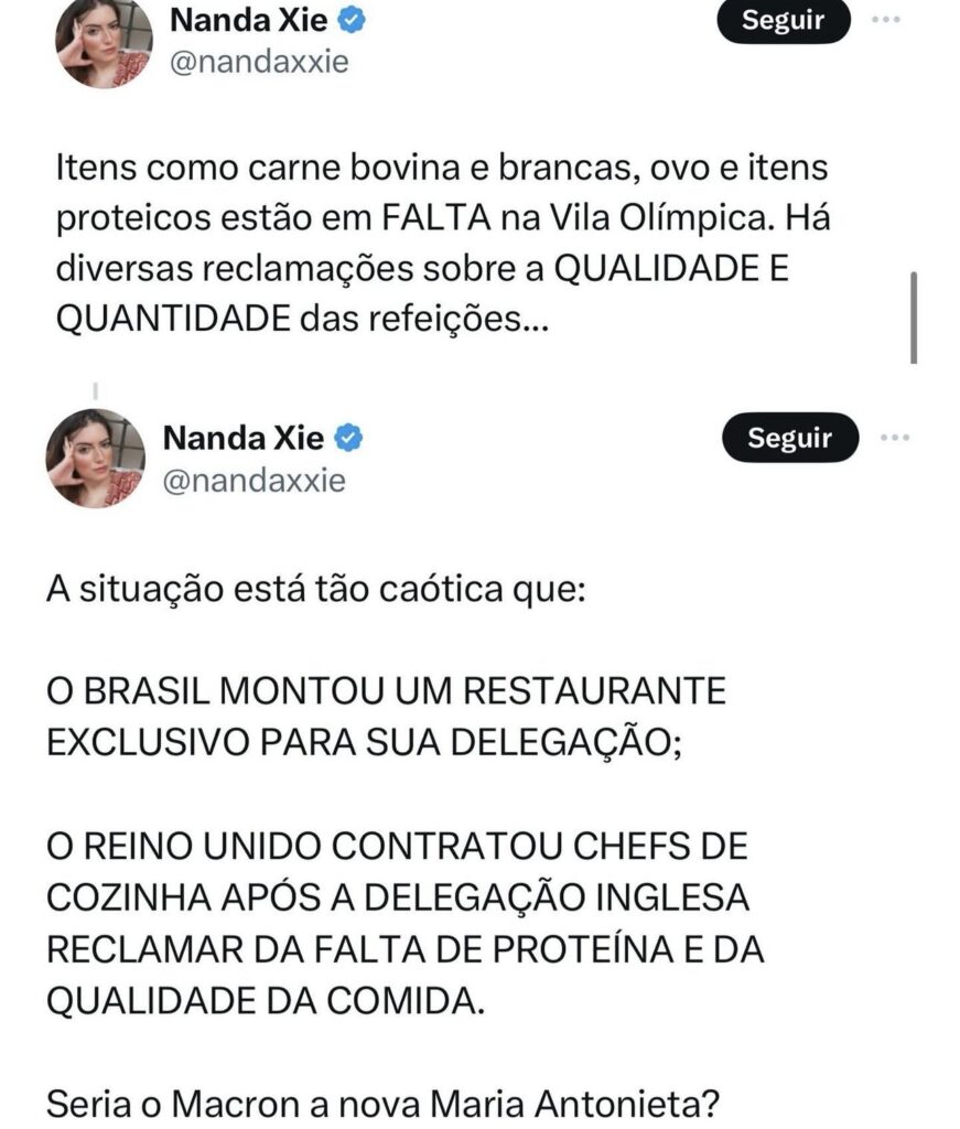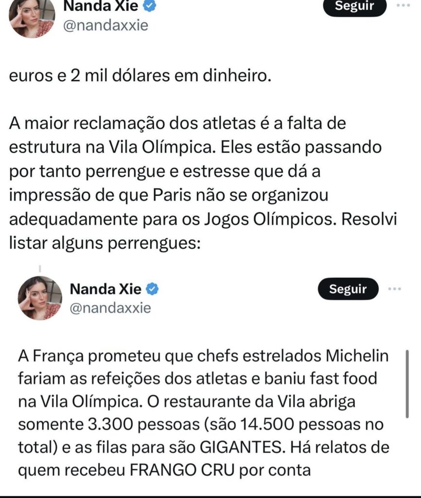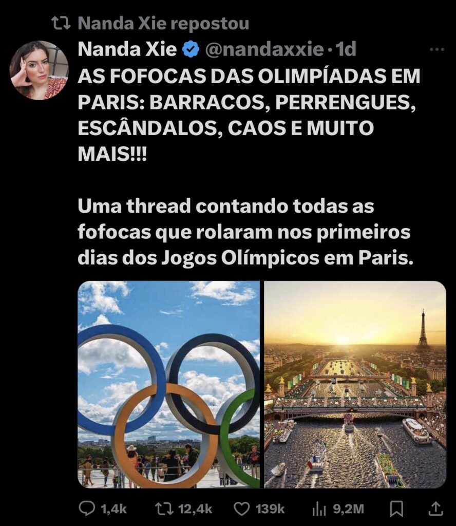 Conforme publicou a influencer Nanda Xie, em sua conta na rede social X, “As fofocas das Olimpíadas em Paris: barracos, perrengues, escândalos, caos e muito mais!!!”, escreveu.