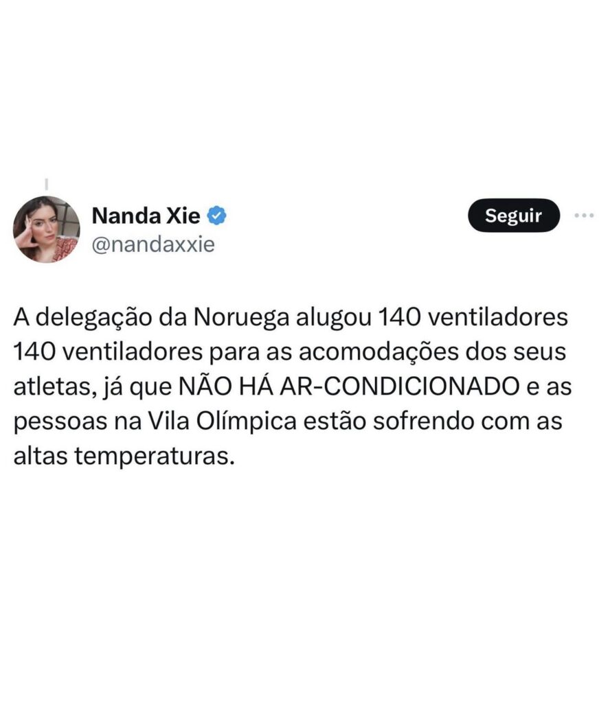 Em um outro post, Nanda conta que atletas da Noruega tiveram que alugar 140 ventiladores porque as acomodações da Vila Olímpica não dispõem de ar-condicionado, e o calor na França está implacável.