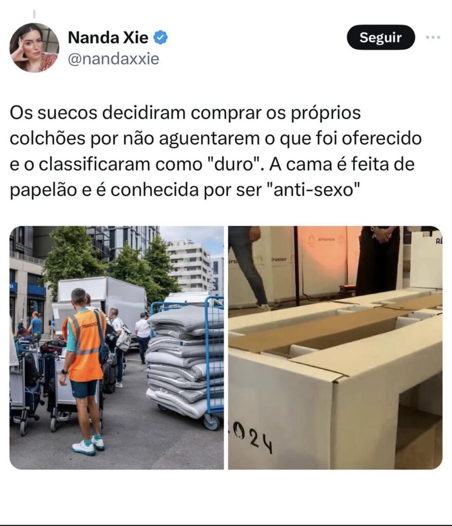 Atletas suecos decidiram comprar outros colchões pós não conseguiram dormir nos colchões oferecidos na Vila, duros e confeccionados com papelão, o chamado “colchão anti-sexo”.