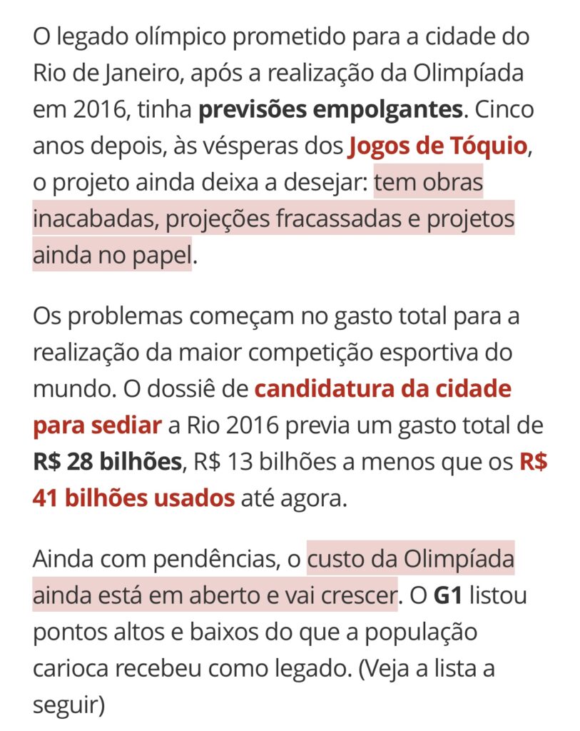 O problema veio somente depois, com obras que ficaram inacabadas e, as que foram utilizadas durante as competições, após o término dos jogos ficaram sem serventia virando elefantes brancos para a cidade do Rio de Janeiro, como bem destacou reportagem do G1 em 2021, antes das Olimpíadas de Tóquio.