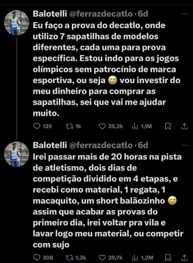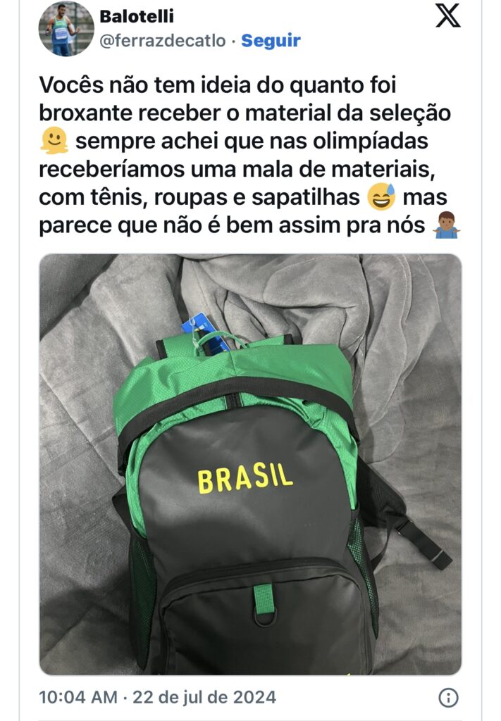 O atleta de decatlo pelo Brasil, Balotelli, revelou sua frustração com os uniformes das competições, antes mesmo de embarcar para Paris, revelando que não recebeu equipamentos suficientes para as provas. Ele desabafou em sua conta no X.