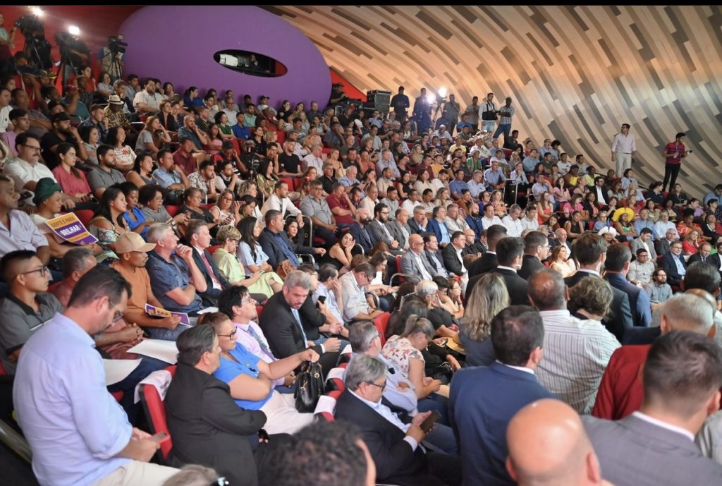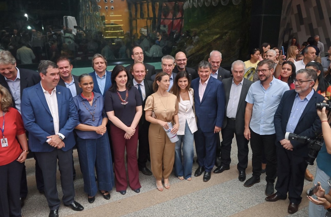 O governador Eduardo Riedel e os ministros de Desenvolvimento e Assistência Social, Família e Combate à Fome, Wellington Dias; do Planejamento e Orçamento, Simone Tebet; e a ministra de Meio Ambiente e Mudança do Clima, Marina Silva, participaram nesta segunda-feira (18) pela manhã, no Bioparque Pantanal, da cerimônia de assinaturas de adesão a programas federais para a redução da pobreza no Mato Grosso do Sul e anúncio da liberação de R$ 120 milhões para o enfrentamento à fome.