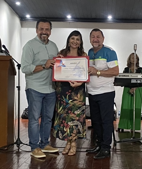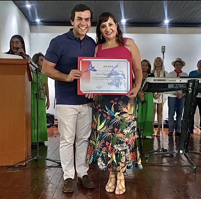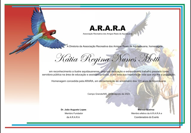 A honraria foi concedida neste domingo (20) à mestra em educação (UFMS) e servidora pública de carreira, Kátia Regina Nunes Ribeiro Motti, em um grandioso evento realizado no Rádio Clube Cidade, pela Associação Recreativa dos Amigos Reais de Aquidauana – ARARA. A festa em celebração aos 131 anos de Aquidauana rendeu homenagens aos cidadãos ilustres, personalidades que contribuem com a história e o desenvolvimento da cidade.