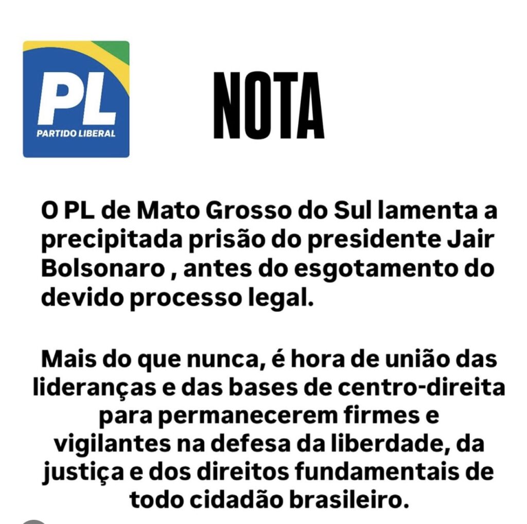 Políticos como Nikolas Ferreira, Marcel Van Hattem, o Partido Liberal Nacional e aqui de Mato Grosso do Sul, também divulgou nota de repúdio.