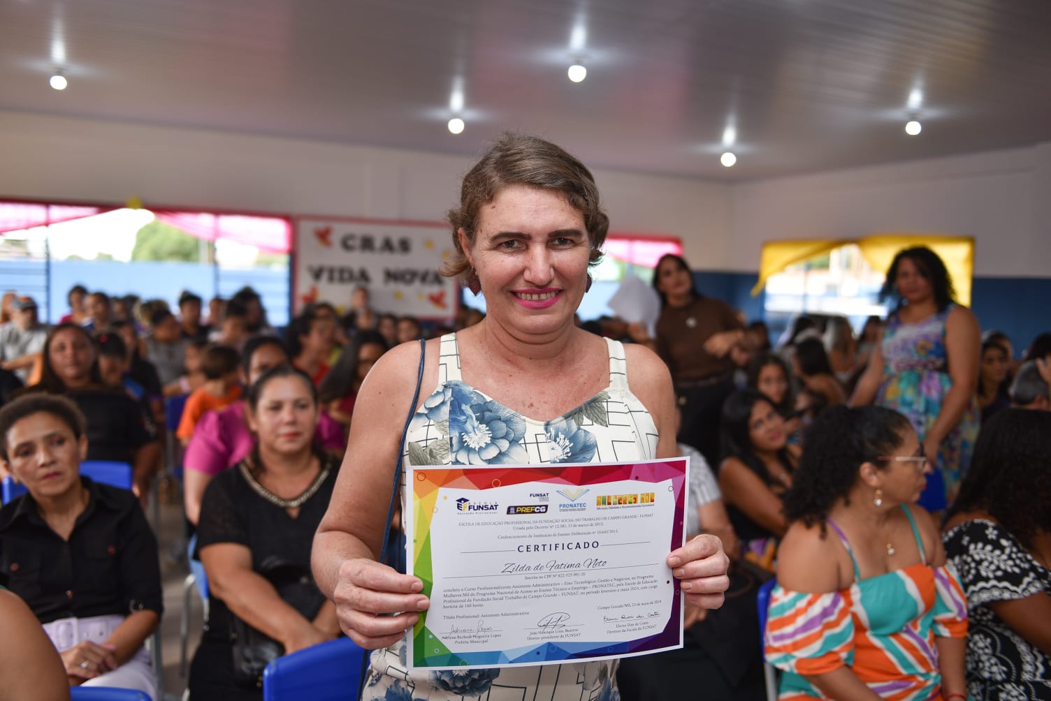 Em cerimônia emocionante, marcada por alegria e gratidão, a Prefeitura Municipal de Campo Grande, por meio da Funsat (Fundação Social do Trabalho), encerrou nessa quinta-feira (23) a 1ª etapa do Programa Mulheres Mil, realizada no Cras do Jardim Vida Nova. No local, cerca de 100 mulheres participaram do curso de Assistente Administrativo, promovido pela Escola de Educação Profissional da Funsat.