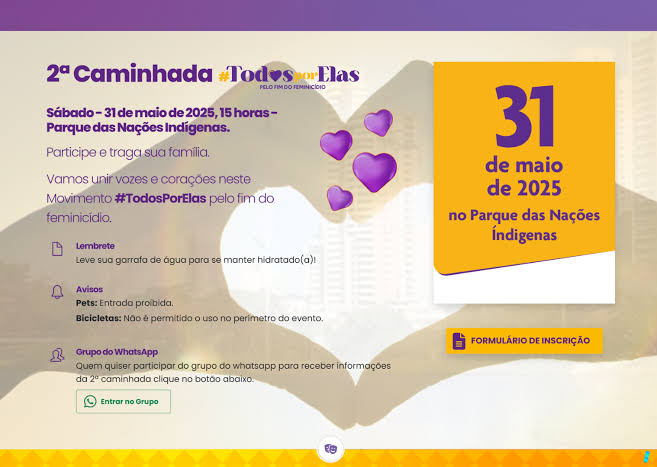 A caminhada terá percurso aproximado de 1 km, com largada e chegada na Concha Acústica do Parque das Nações Indígenas. O evento também contará com atividades culturais, apresentações artísticas e ações educativas de conscientização sobre os diferentes tipos de violência contra a mulher.