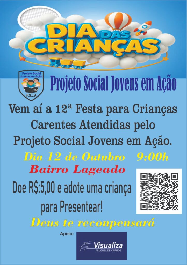 Mas para que essa linda festa aconteça, o Projeto Jovens em Ação precisa de doações. Qualquer contribuição é bem-vinda: alimentos, brinquedos, refrigerantes, doces ou apoio financeiro. Cada gesto faz diferença e ajuda a construir um dia inesquecível para dezenas de crianças que esperam, com o coração cheio de esperança, por esse momento especial.