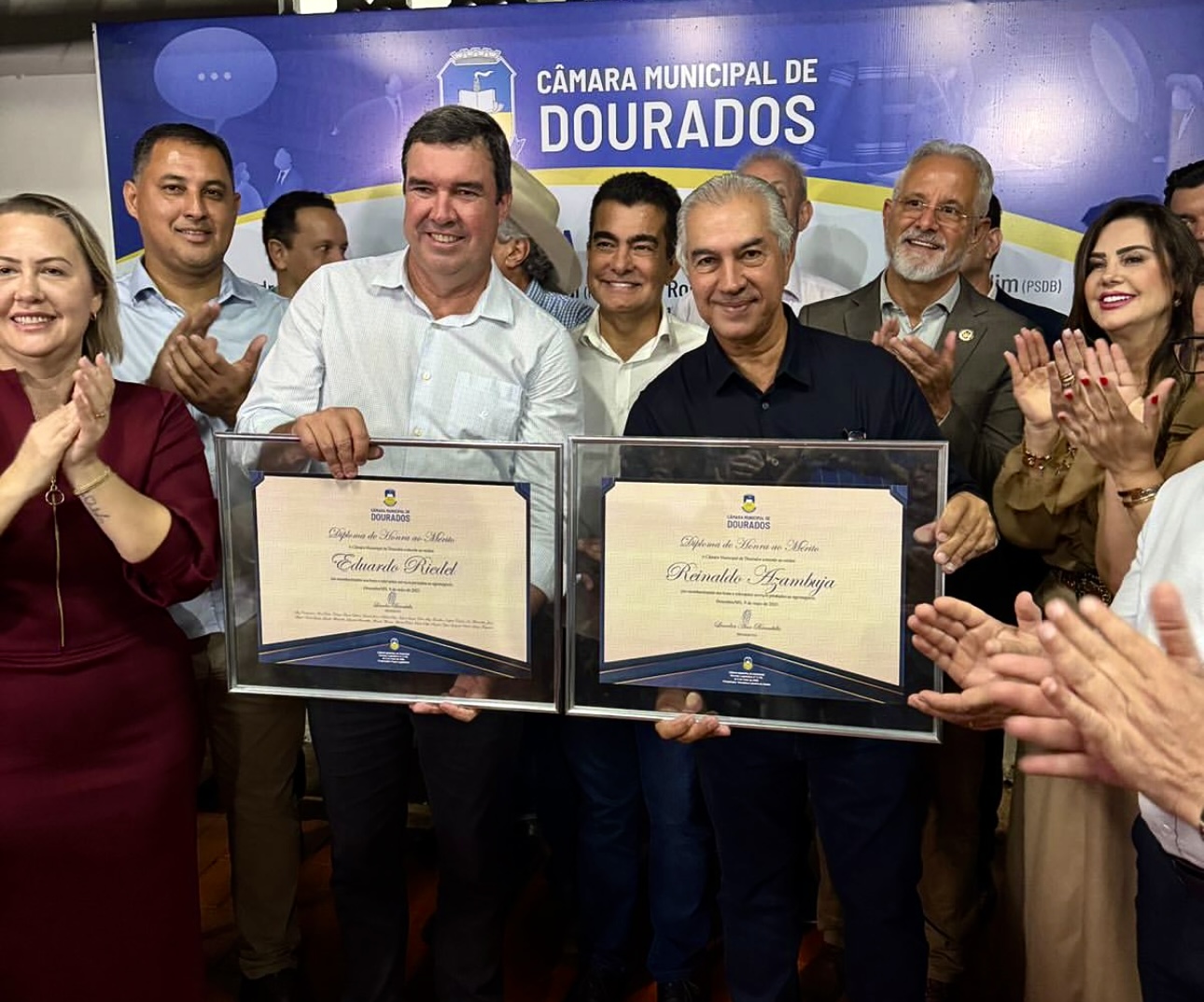 O governador Eduardo Riedel (PSDB) também esteve presente na Expoagro e foi agraciado com a mesma honraria, reforçando a continuidade das políticas de incentivo ao setor agropecuário em MS. Ele também cumpriu agenda intensa em Dourados, acompanhado de Reinaldo Azambuja, secretariado, deputados e autoridades.