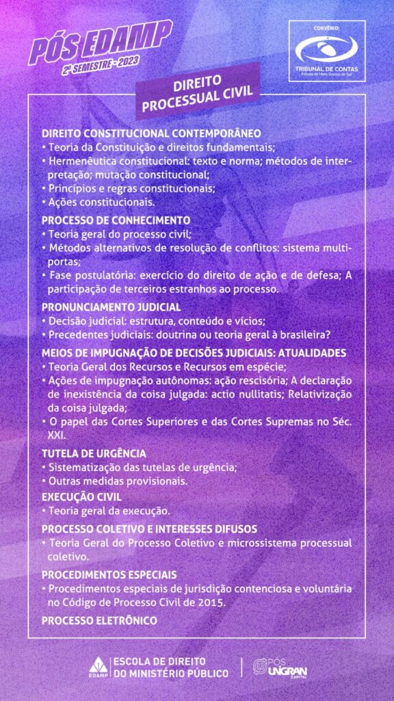 “Tive a oportunidade de cursar essa especialização em Direito Processual Civil, iniciando-a enquanto auditor de controle externo e finalizando-a enquanto Procurador do Ministério Público de Contas. O aprofundamento do conhecimento na matéria de processo civil permite a otimização de minha atuação enquanto fiscal da ordem jurídica, especialmente quanto à missão de garantir a observância do devido processo legal nos feitos que tramitam perante esta Corte de Contas”, destacou.