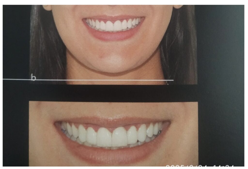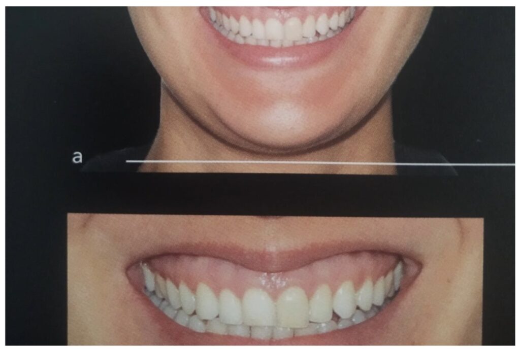 Sinais e Sintomas: Na dinâmica muscular do sorriso, havia exposição excessiva de gengiva maxilar, o que caracteriza o sorriso gengival superior.